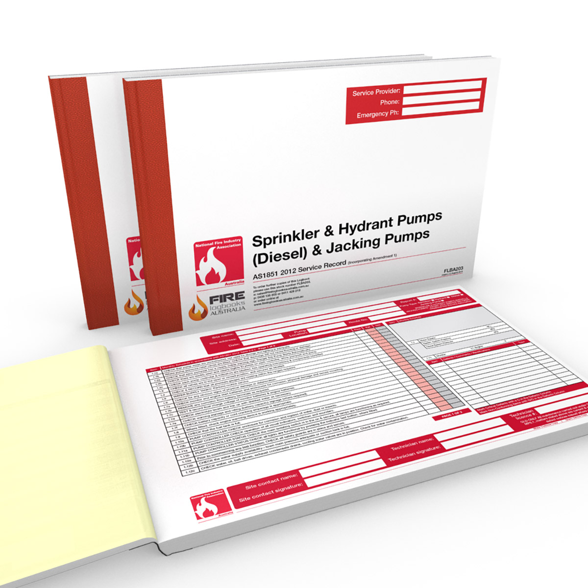 The FLBA 203 Sprinkler & Hydrant Pumps (Diesel) & Jacking Pumps aligns with AS 1851 2012 Incorporating Amendment  1, referencing Sections  2 (automatic sprinkler systems) and Section  3 (fire pumpsets). Designed for a two year cycle, it covers monthly and six monthly inspections, annual functional tests, and a biennial comprehensive service of diesel pump performance, controls, flow, and pressure metrics. This logbook helps ensure compliance with the required documentation of testing per AS1851-2012 Incorporating Amendment 1.