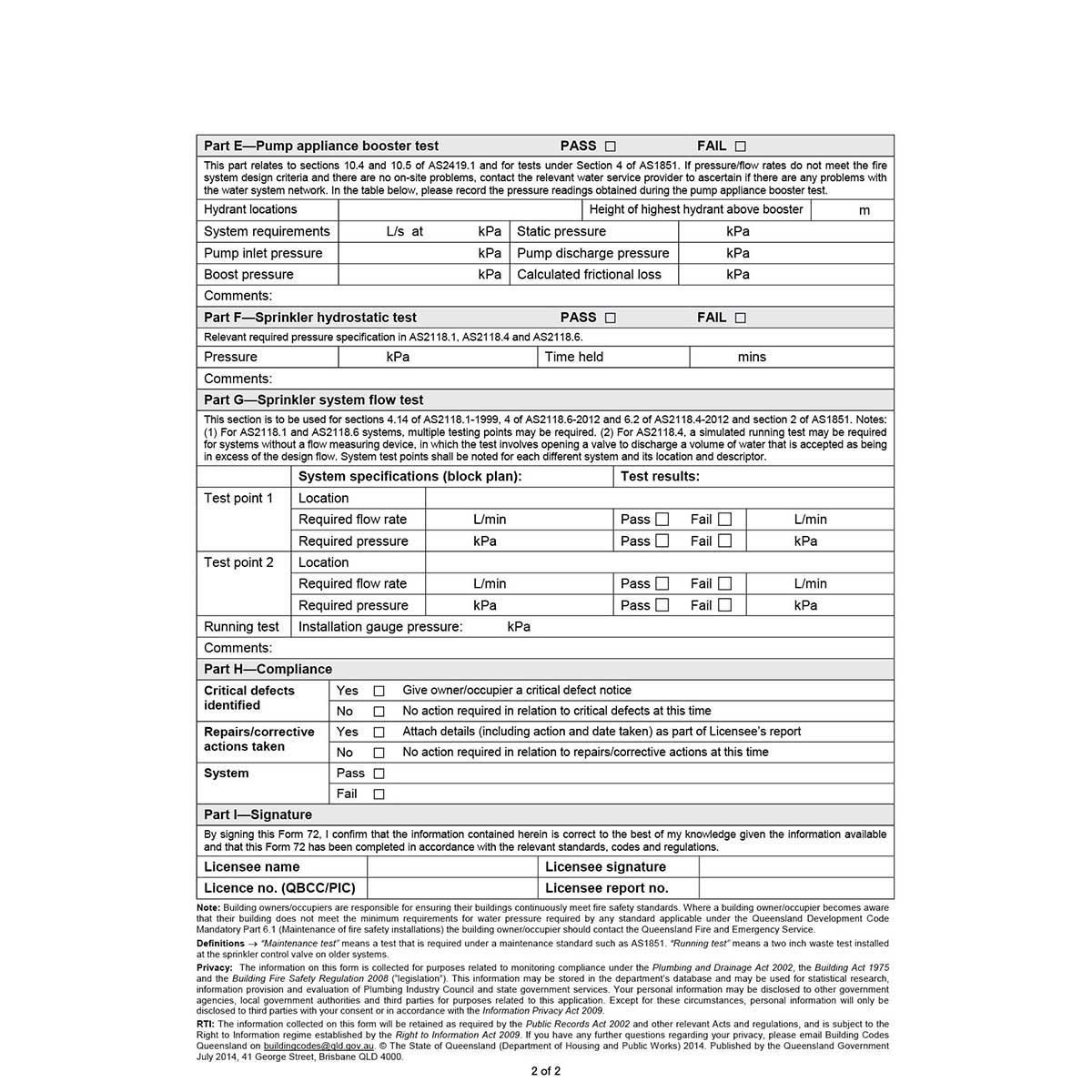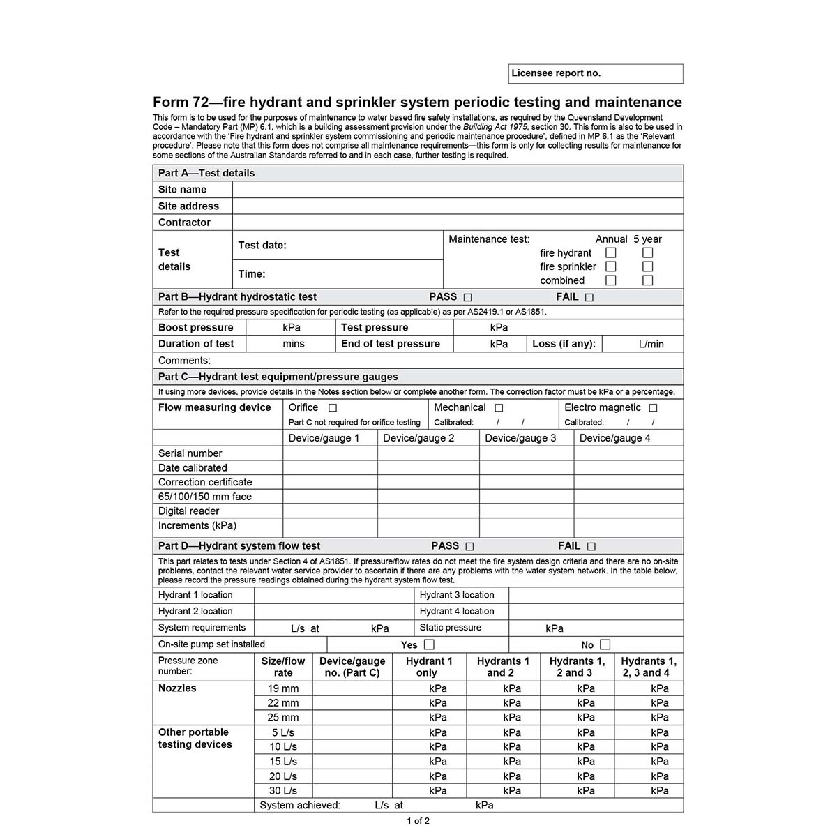 Form 72 (Queensland), Fire Hydrant and Sprinkler Systems, Periodic Testing and Maintenance