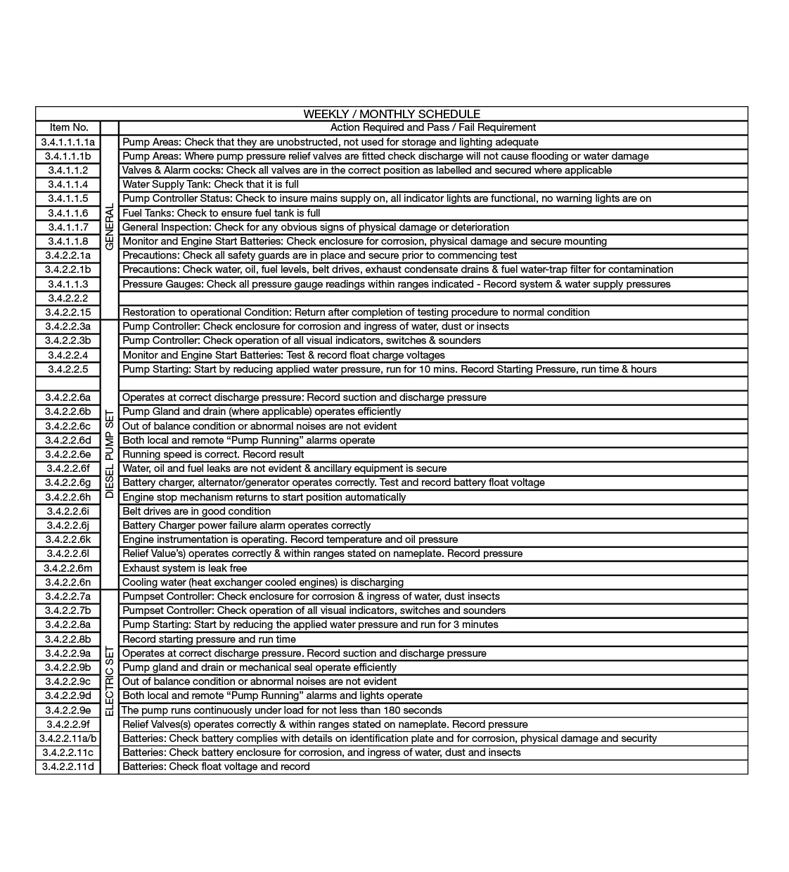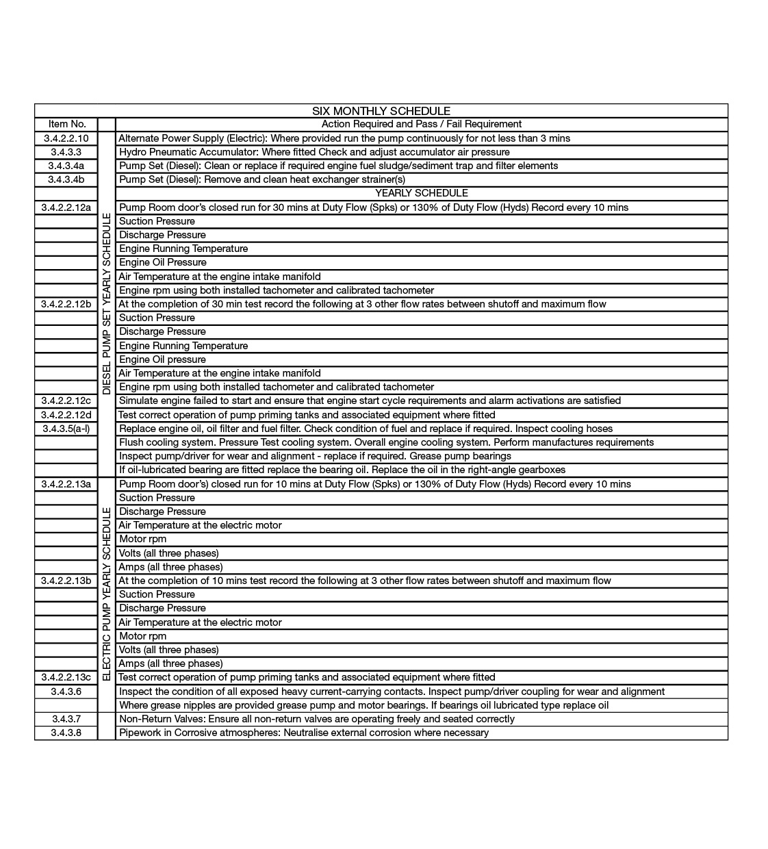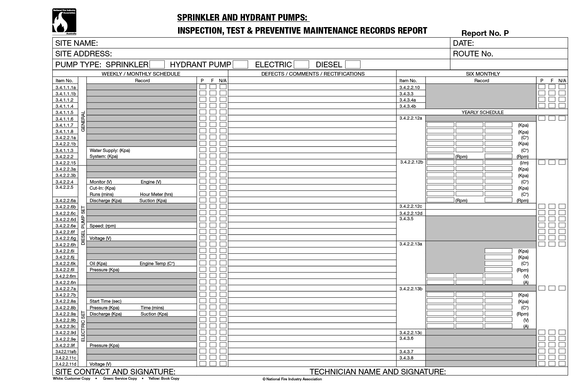 NFIA 503  Sprinkler and Hydrant Pumps. AS 1851-2005 Inspection, Test and Preventative Maintenance Records Report. 50 sets in triplicate per book, NCR Stock, overall size 210mm x 320mm, landscape, bound at left with guard sheet.