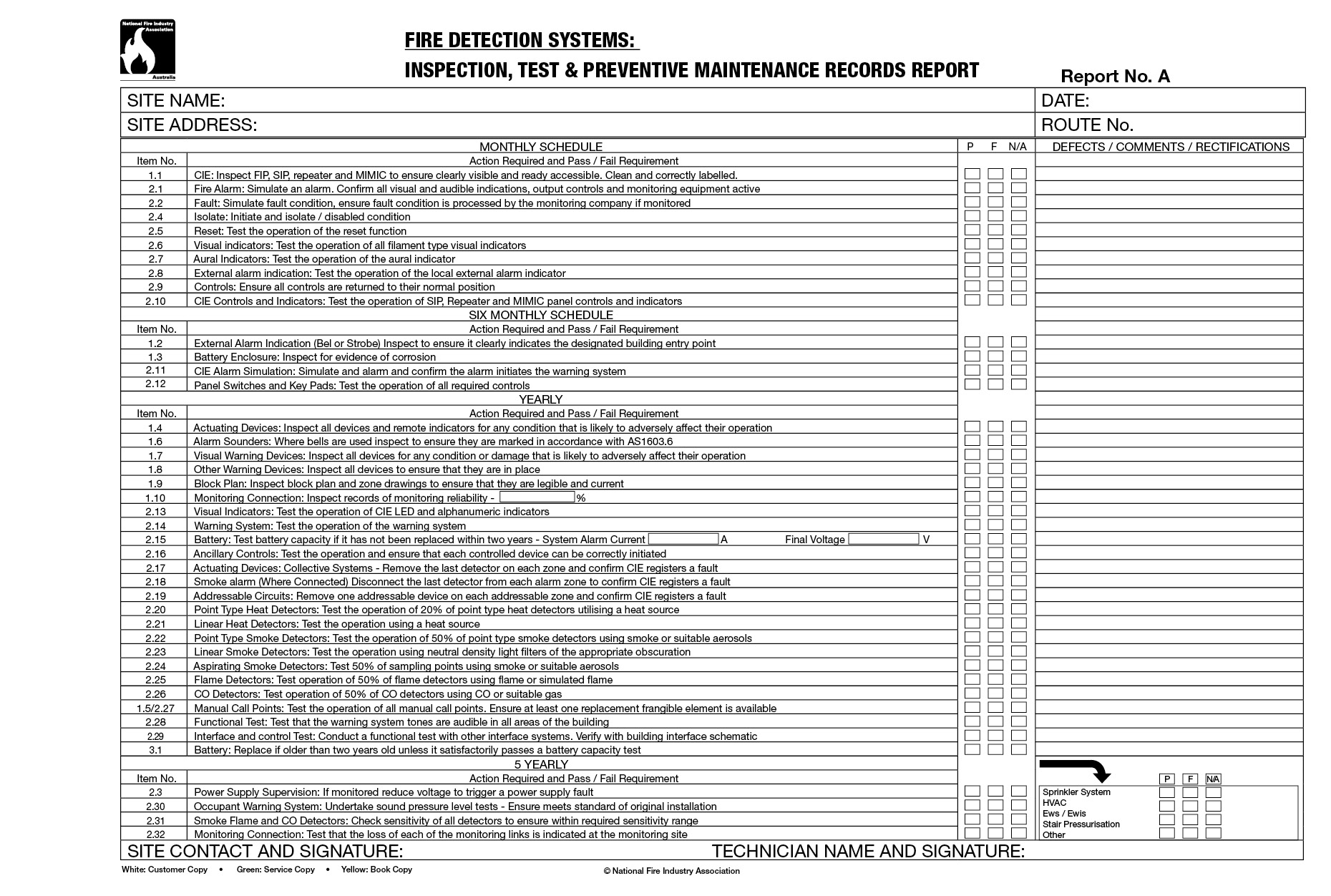 NFIA 507 Fire Detection Systems. AS 1851-2005 Inspection, Test and Preventive Maintenance Records Report.